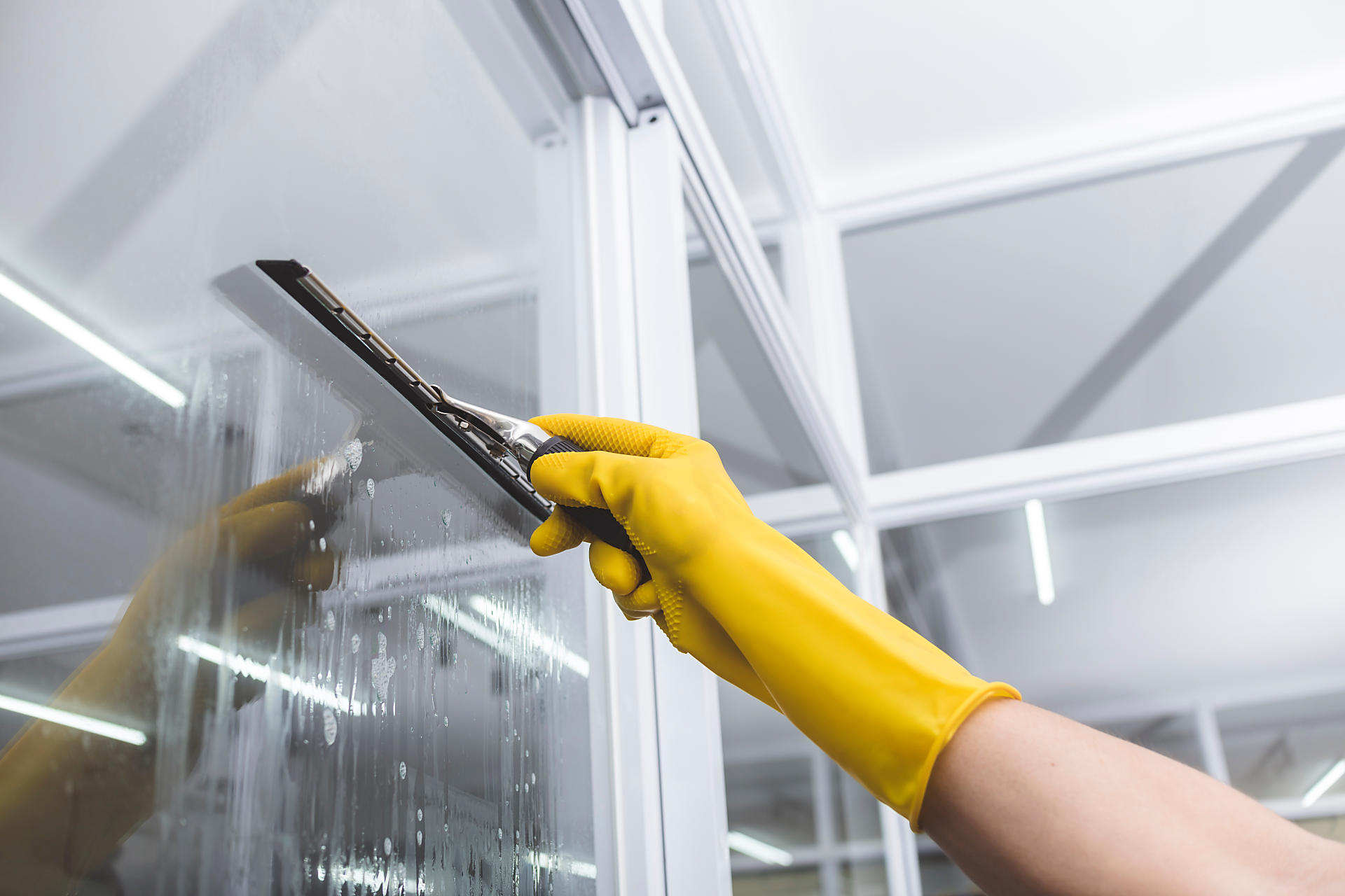- 窓用ワイパーをガラス面から浮かせないようしっかり持ち、ブロックを区切りながら上から下へ拭き取っていきます。