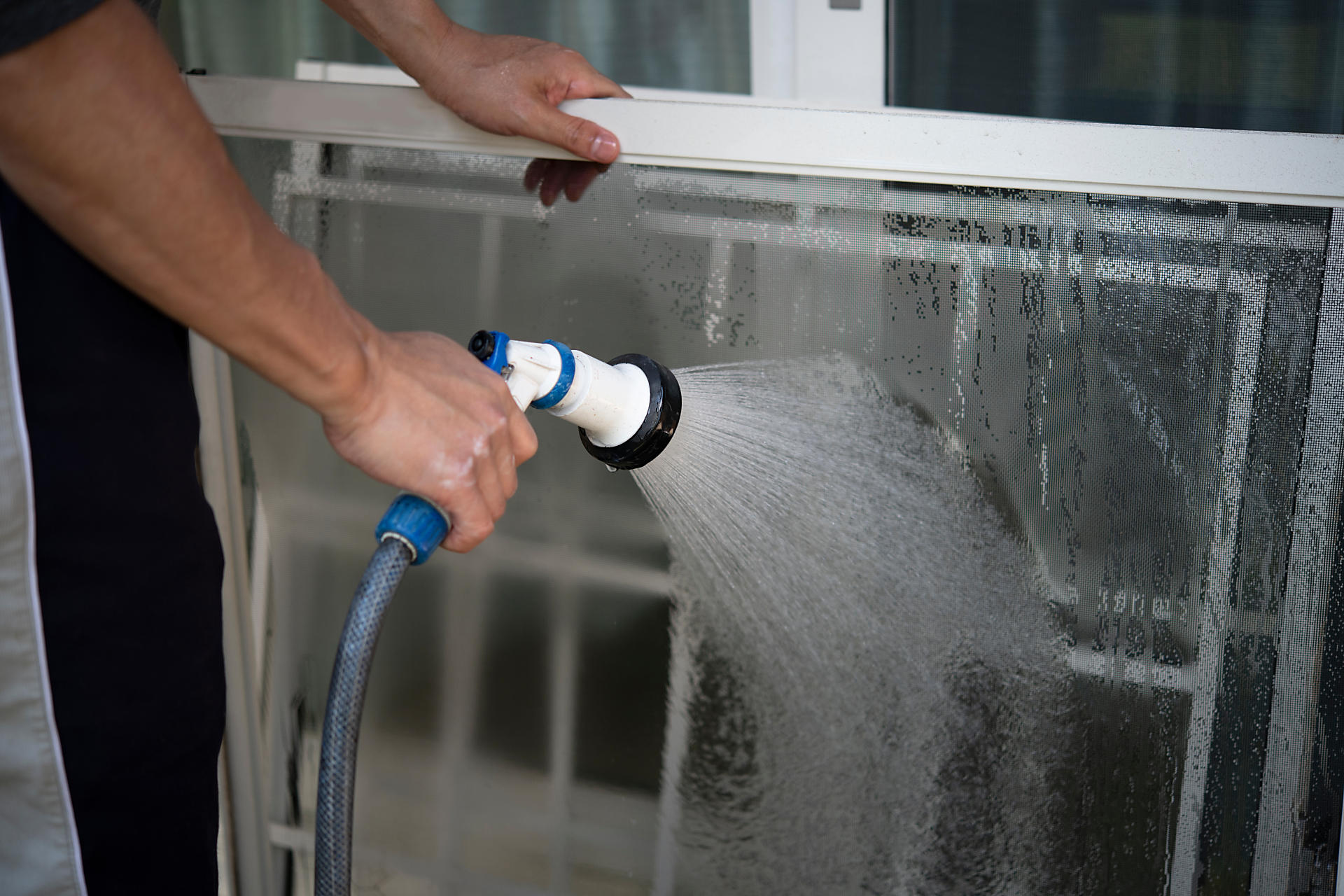 - 網戸を取り外し、外やベランダなど水で洗える場所でホースなどを使用しながら水で洗います。外やベランダがない場合、お風呂での掃除が可能ならばお風呂で洗います。